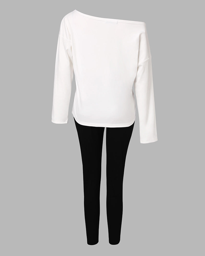 2 Piece Leopard Heart Love Print Skew Neck Top Drawstring Waist Pants Casual Tracksuit Set