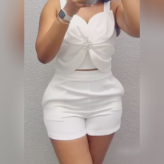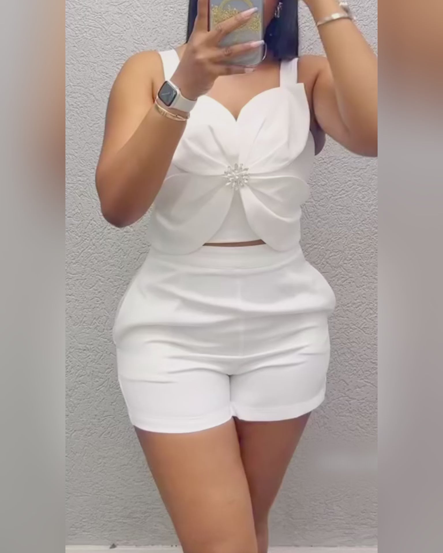 2 Pieces Outfit 3D Flower Decor Sweetheart Neck Thick Straps Shirred Back Crop Top and Casual Elastic Back Waist Shorts Set