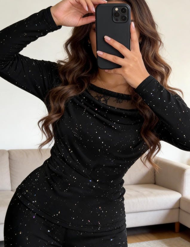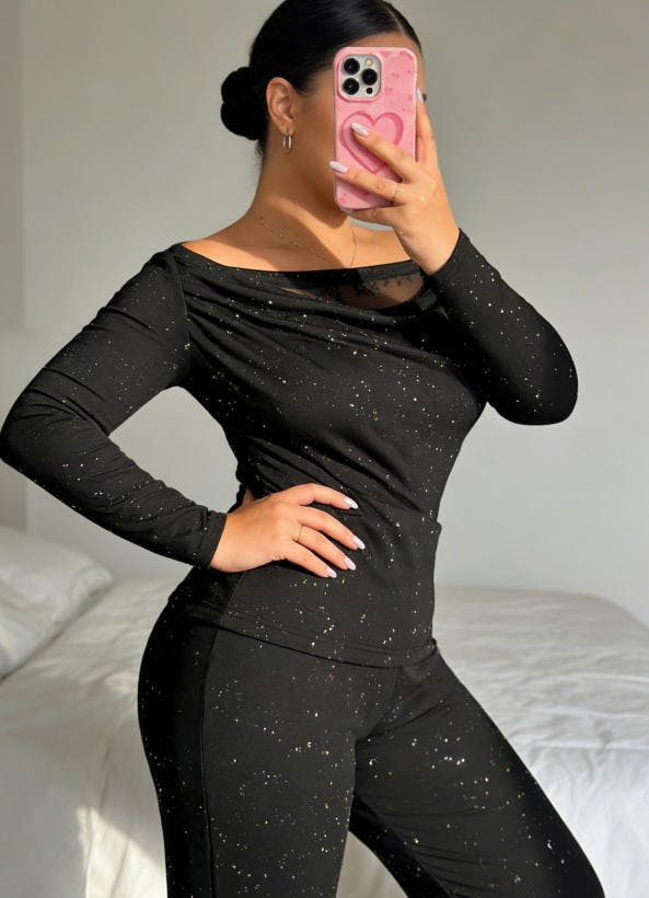 Material & Comfort: Crafted from 94% Polyester and 6% Elastane, this set offers a soft, stretchy feel that moves with your body while maintaining shape. The glitter finish adds subtle texture without sacrificing comfort, making it suitable for extended wear.