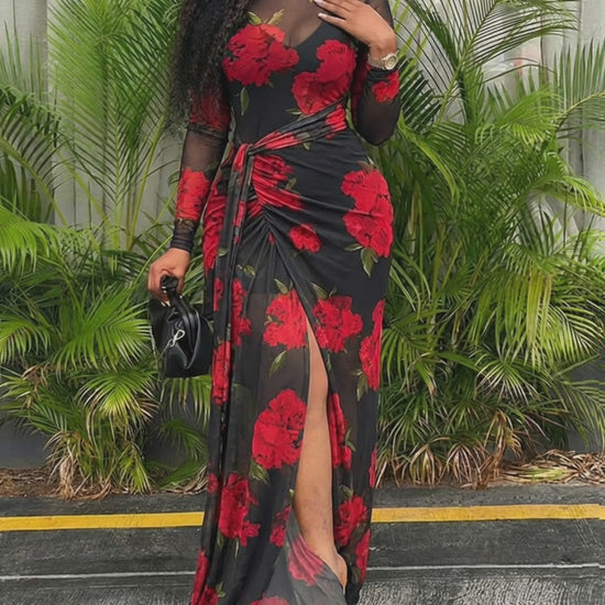 Design Details: Allover floral print adds visual depth through sheer mesh. Ruched detailing and a side slit enhance movement, while the waist tie and soft draping define the figure. The mesh maxi back features hollow-out button closure for easy wear.