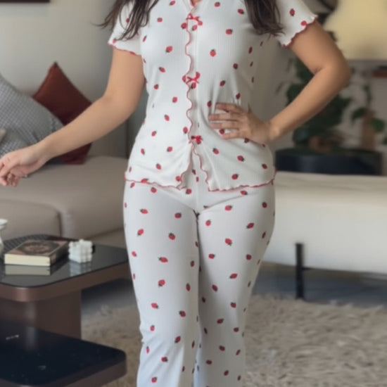 Strawberry print pajamas – All-over playful strawberry print adds a cute, youthful touch, perfect for loungewear with a fun twist.