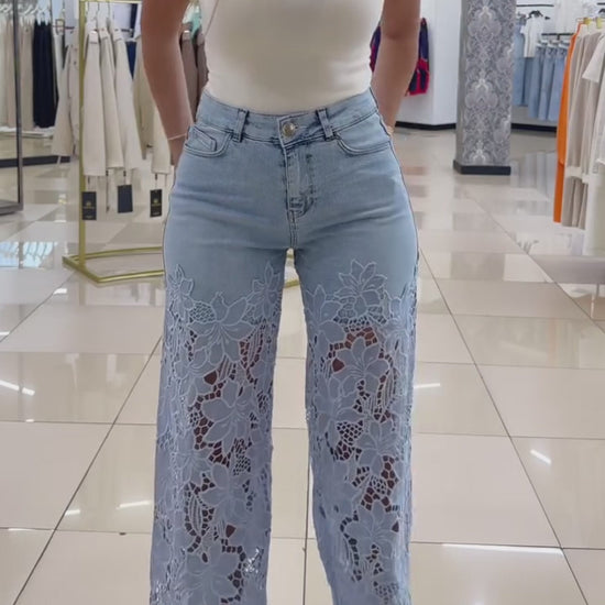 Stunning guipure lace jeans! High waist cinches the waist, wide leg flatters all body types. Washed fabric is soft to touch, zipper fly is durable, great quality!