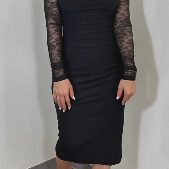 Design Details: Square neckline with lace trim and long lace sleeves; backless style with zipper closure and rear slit adds subtle allure.