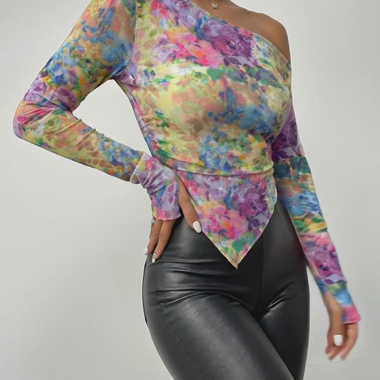 Tie Dye Floral Print Skew Neck Long Sleeve Asymmetrical Hem Tee Slim Fit Side Ruched Sheer Mesh Top with Thumb Hole Cuffs & Lining