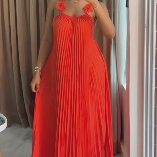U-Neck 3D Flower Decor Adjustable Spaghetti Straps Maxi Dress Sexy Backless Criss Cross Back Pleated Dress
