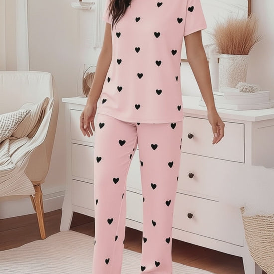 Valentine's Day 2 Pieces Outfit Round Neck Short Sleeve Top and Elastic Waist Pants Set Casual Heart Print Loose Fit Pajamas Set