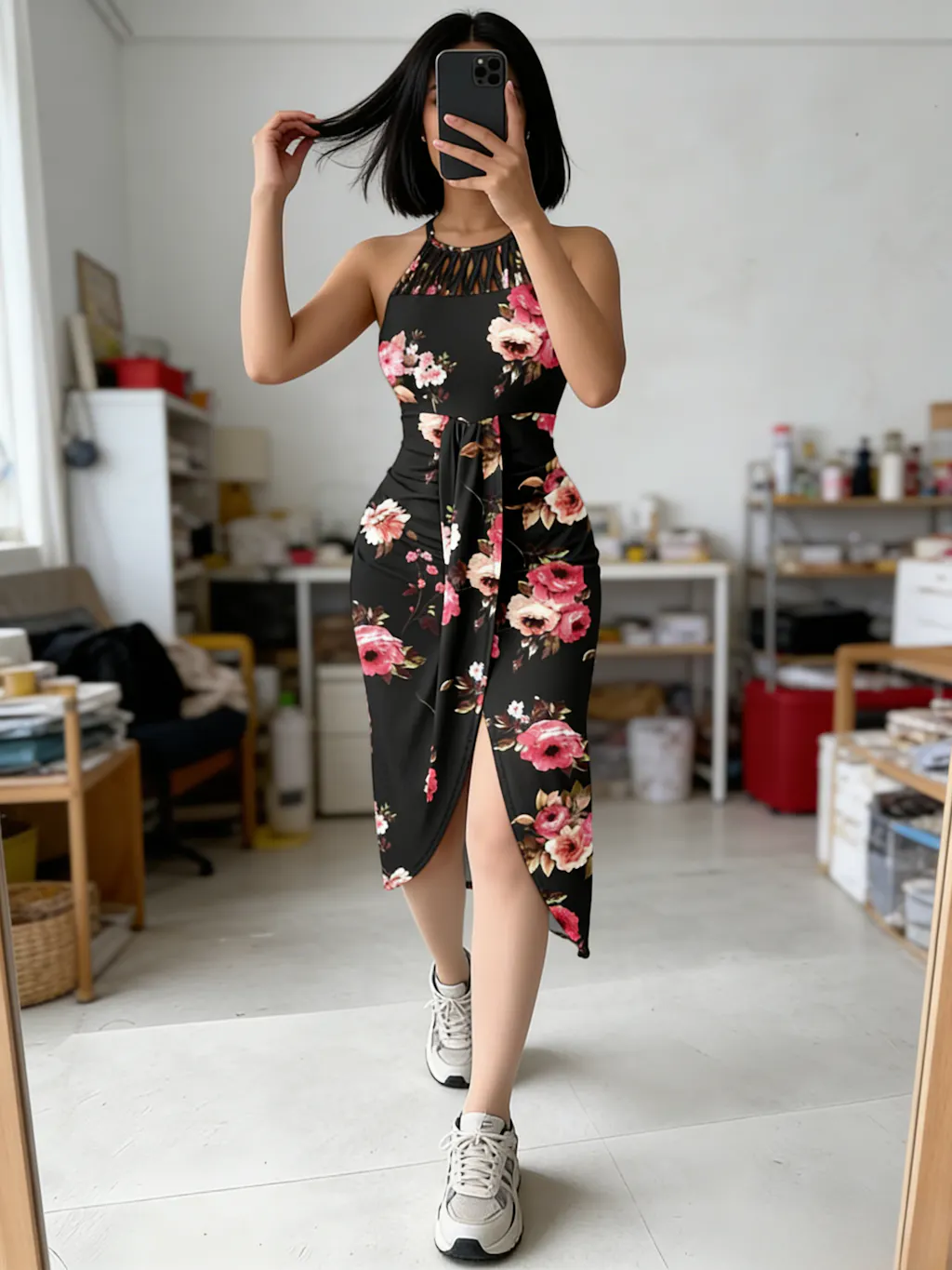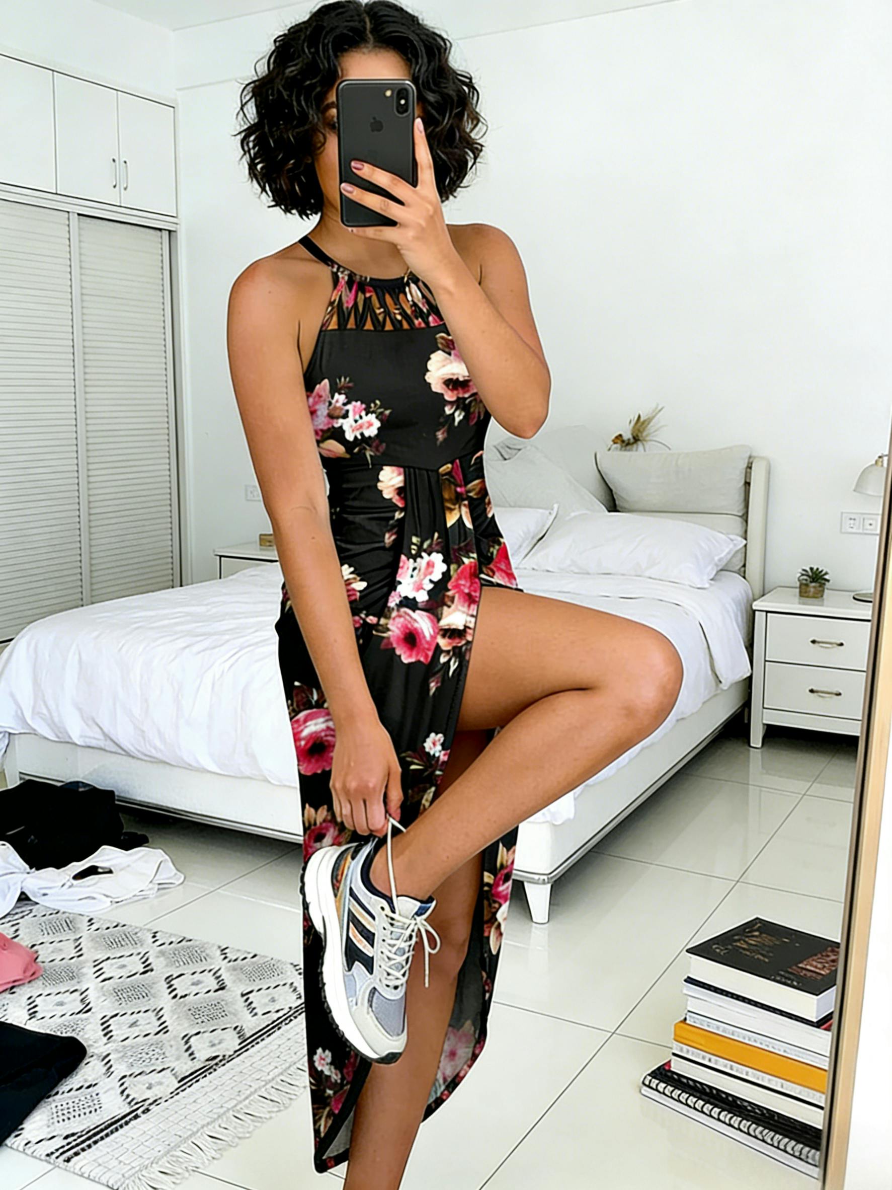 Design Details: Features a halter neckline with criss-cross hollow-out detail that highlights the shoulders and neckline. Colorblock floral print creates vivid contrast and flowing visual movement, while the front slit adds mobility and subtly lengthens the leg line.