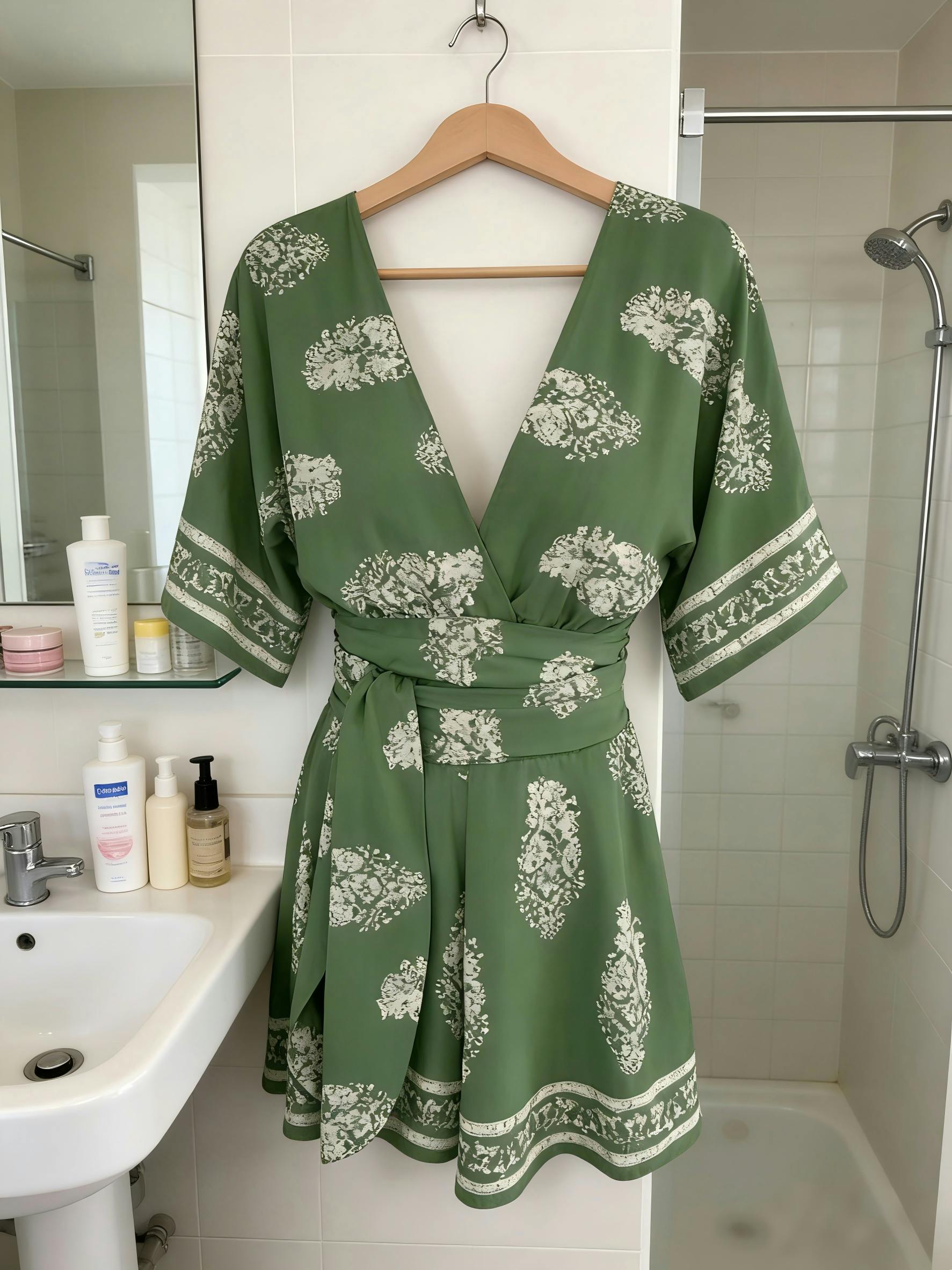 Silhouette & Fit: This romper has a regular fit with a tie waist that allows adjustable shaping. The short sleeves and above-knee length provide ease of movement while offering relaxed coverage, balancing comfort with a flattering shape.