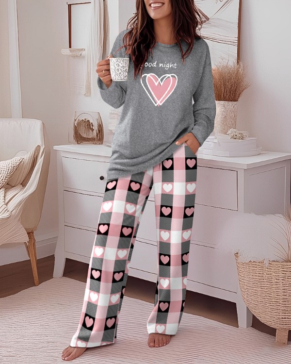 2 Pieces Outfit Letter and Heart Print Long Sleeve Top and Casual Plaid Pnats Sets with Pocket