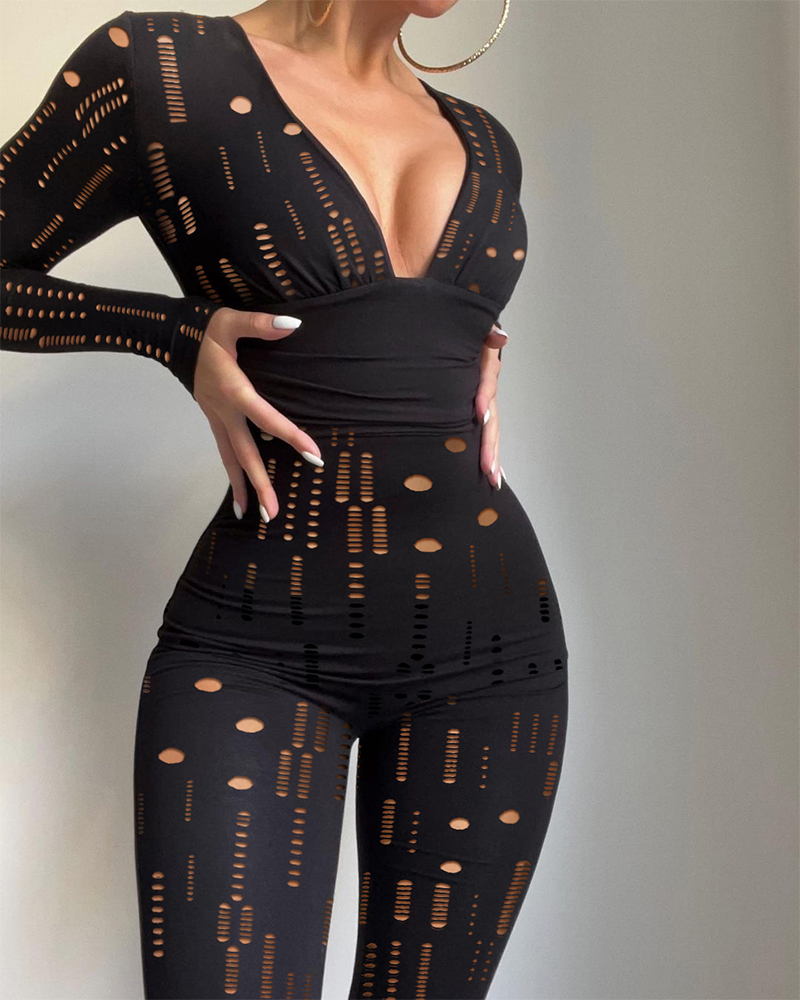 Deep V-Neck Hollow-out Zipper Back Skinny Jumpsuit