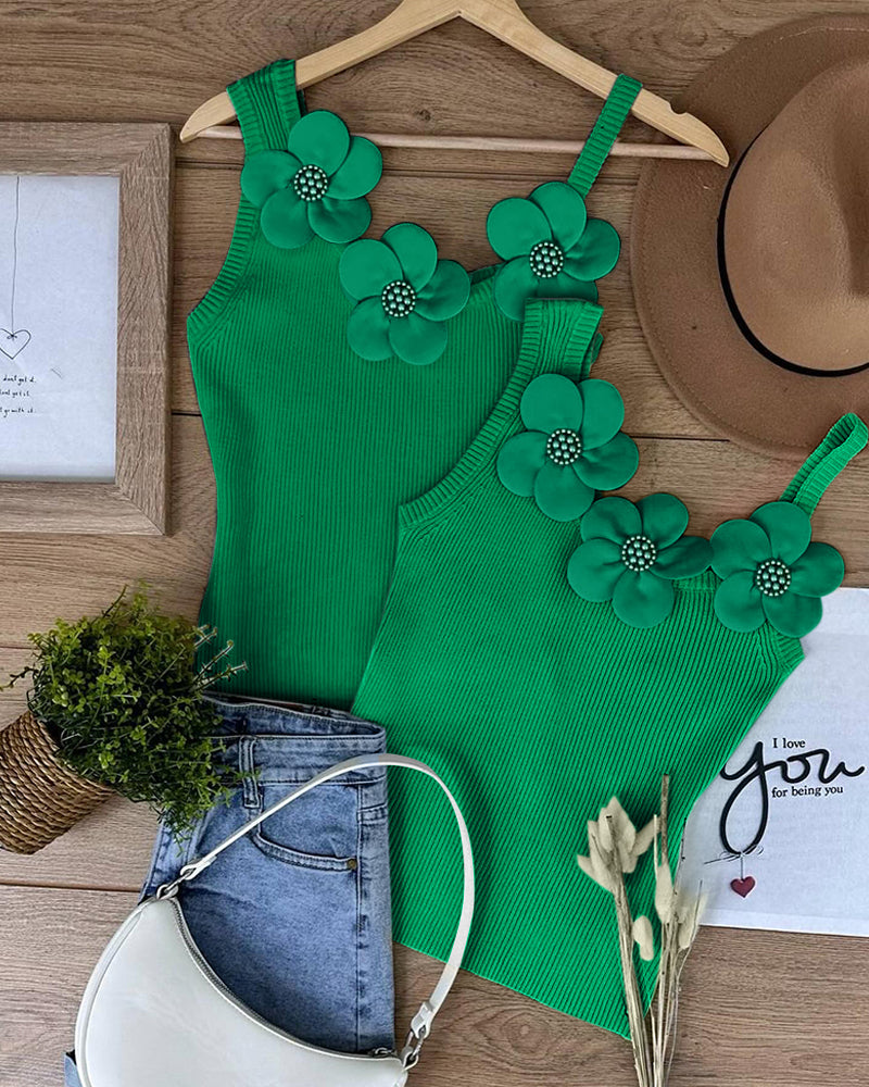 2 Pack Solid 3D Flower Tank Top Asymmetrical Neck Sleeveless Casual Ribbed Knit Camisole
