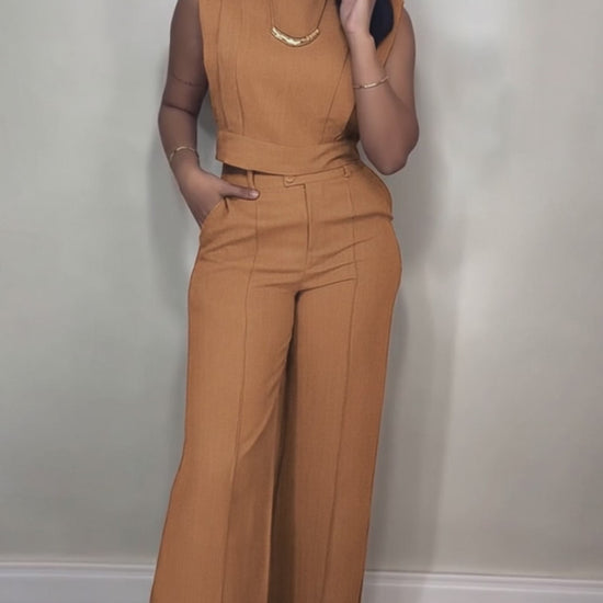 2 Pieces Outfit 3D Cutting Decor Design Cap Sleeve Hollow-out Back Crop Top and Casual Zipper Fly Seam Front Straight Pants Set