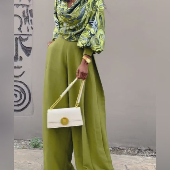 Balanced Two-Piece Fit: Includes a cowl neck lantern sleeve crop top and ruched wide-leg pants, designed in a roomy silhouette that moves with ease.