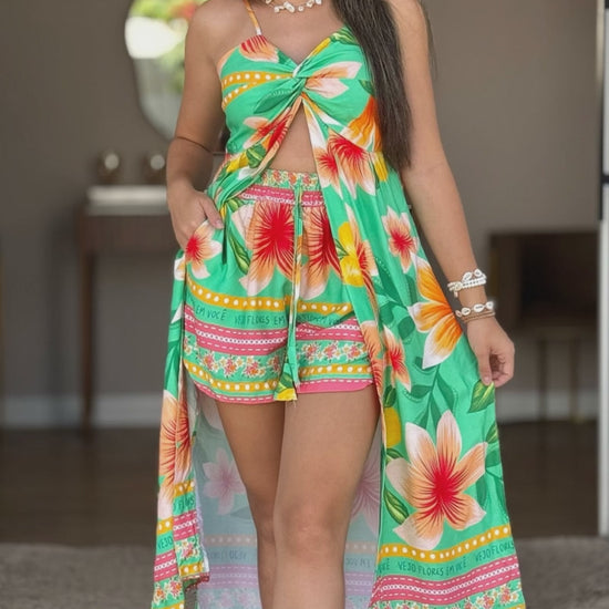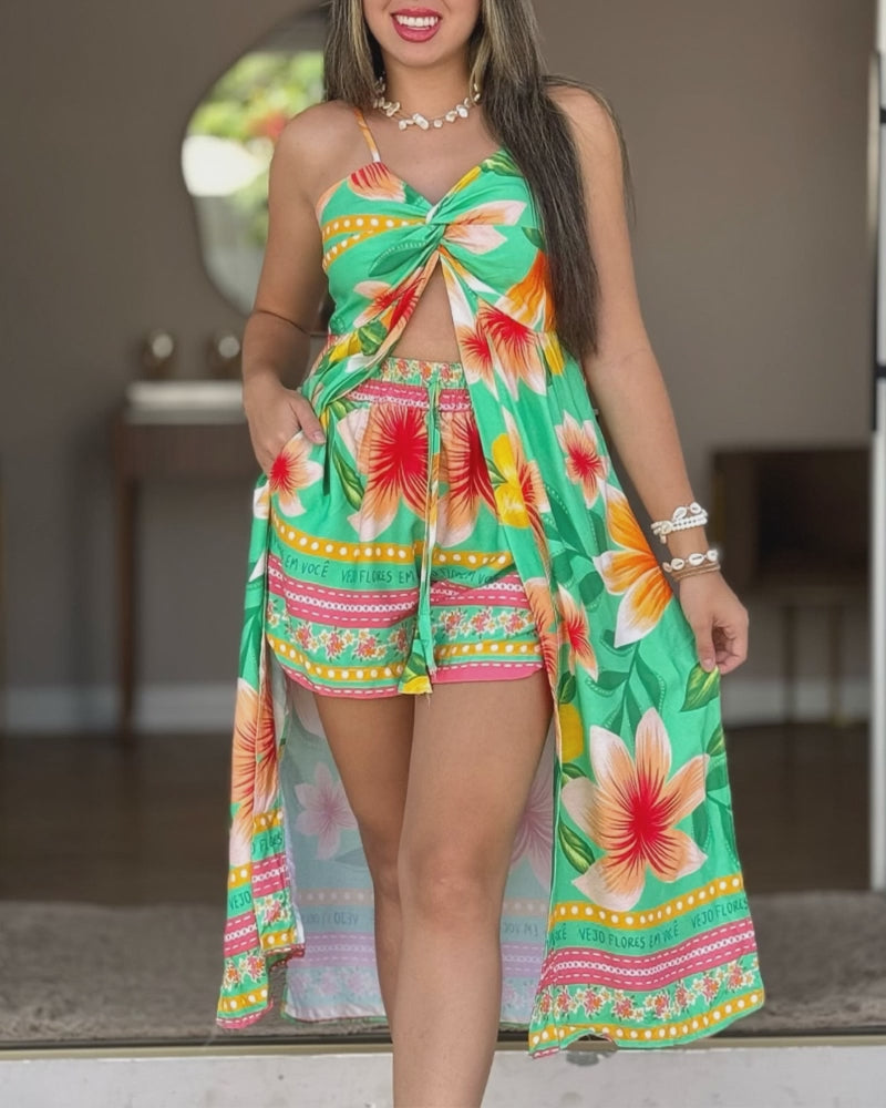Design Details: V-neck spaghetti strap top features twist-front detail, shirred back, and backless design. Long slit overlay adds movement, while floral print and pocketed shorts balance style and function.