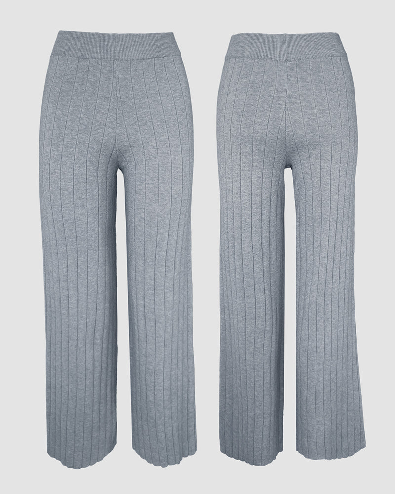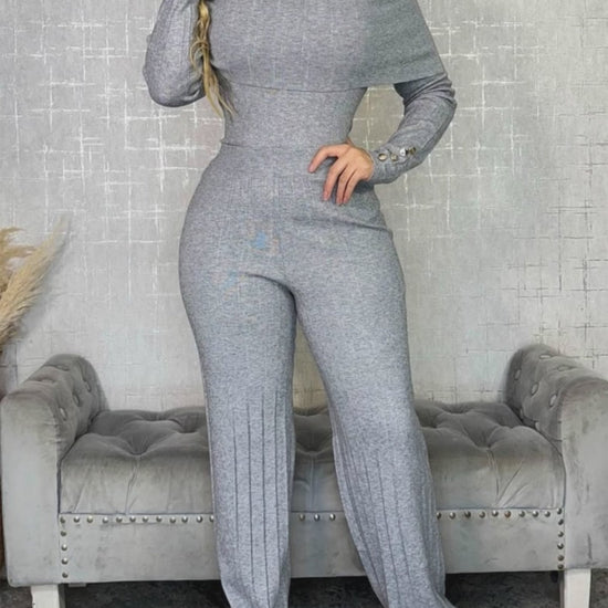 2 Pieces Outfit Button Decor Foldover Off Shoulder Slim Fit Top and Elastic Waist Wide Leg Pants Set Casual Ribbed Set