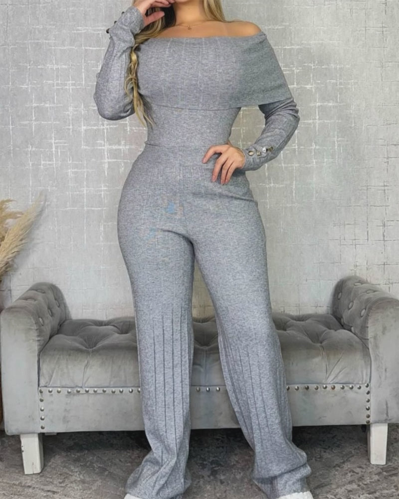 Design Details: Foldover off-shoulder cut with button accents adds a chic touch, long fitted sleeves contrast the flowy pants for a stylish casual outfit.
