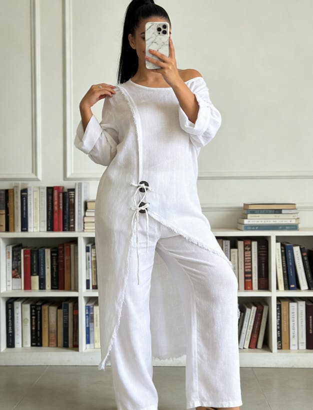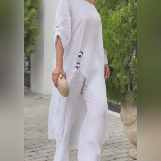 - Design Details: Features one-shoulder turn-up sleeve top with button decor, mid-length slit with raw fringed edges, and pants with drawstring elastic waist for adjustable comfort.