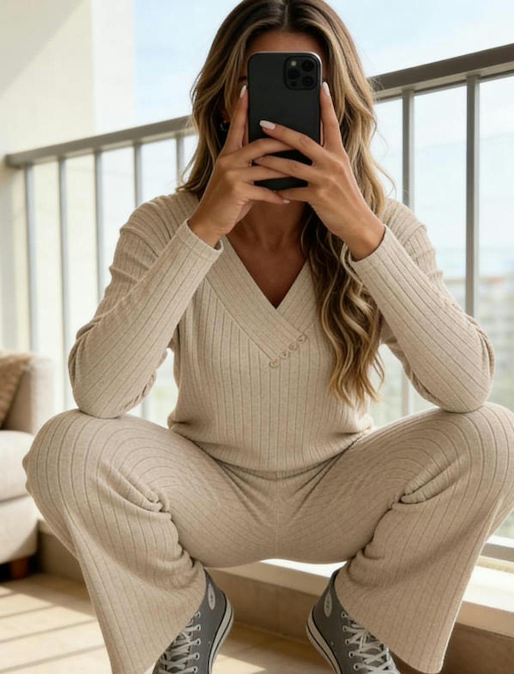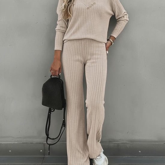 Design Details: Features full vertical ribbing throughout, V-neckline with button accents, and elastic-waist straight-leg pants. The coordinated knit top and pants create a cohesive, effortless, and stylish two-piece set.