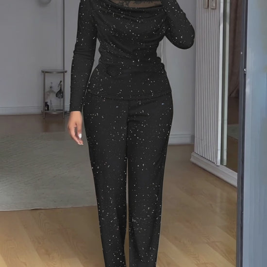 Design Details: Features a glitter overlay throughout, lace splicing along the neckline, and subtle ruching details that enhance dimension. The top can be worn traditionally or off-shoulder for a versatile look, while the pants include functional pockets.