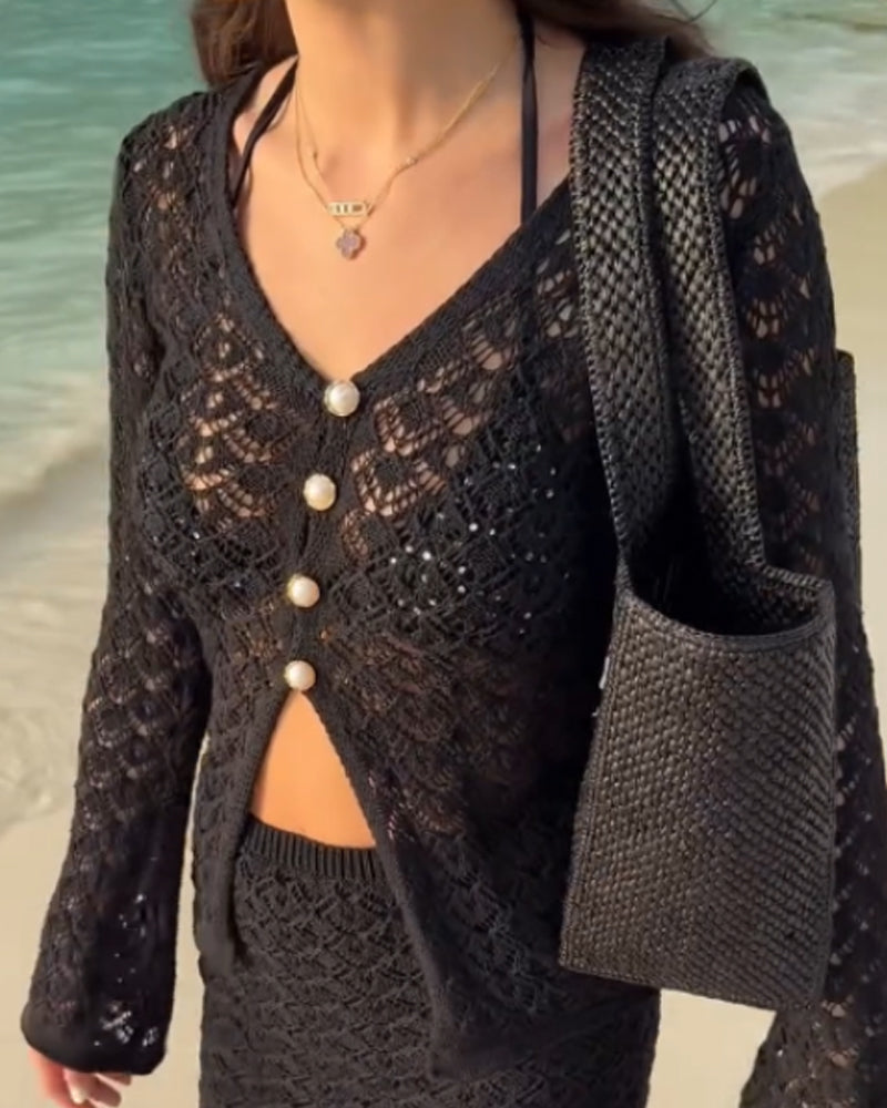 2 Pieces Outfit Deep V Neck Flare Sleeve Half Pearl Button Front Slit Top And Elastic Waist Skirt Set Casual Slim Fit Knit Set