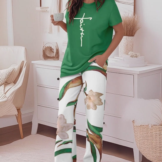 2 Pieces Outfit Faith Letter Print Round Neck Short Sleeve Top and Floral Print Elastic Waist Pants Set Casual Pajamas Set