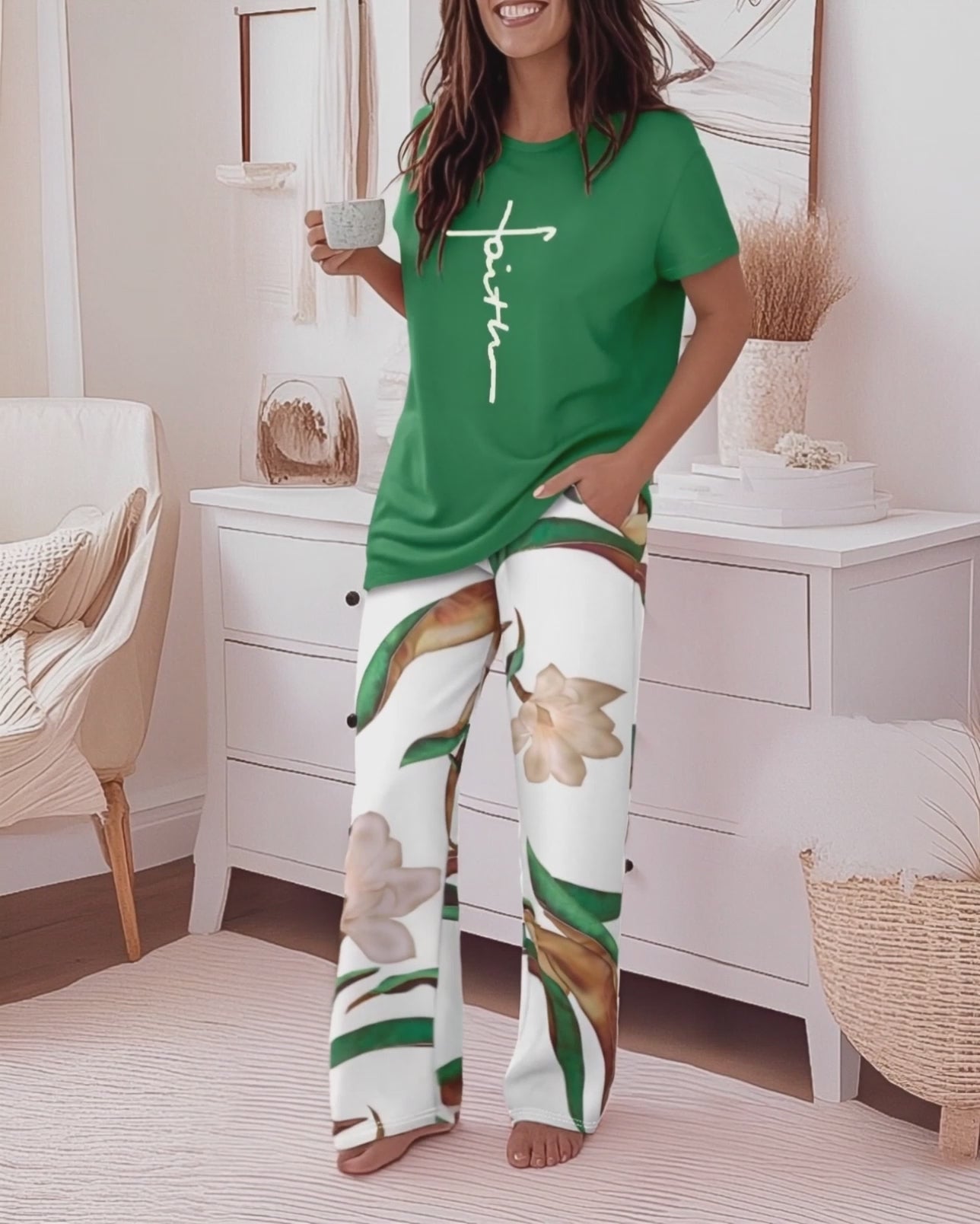 Design Details: Top features “Faith” letter print on the front for a casual statement. Pants are fully printed with floral and leaf motifs, creating layered visual interest. Functional side pockets add practicality without compromising style.