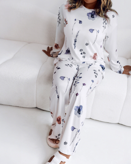 Design Details: Coordinated floral print on both top and pants, elastic waistband on pants, and functional pockets combine cozy comfort with playful, feminine style.