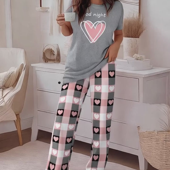 Design Details: The top includes a playful “Good Night” slogan with heart graphics, while the pants feature matching plaid and heart prints. The pants come with functional pockets for holding small items, adding convenient use to the set.