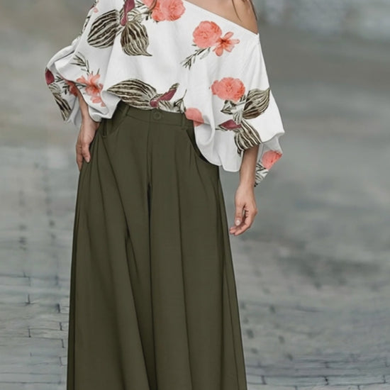 2 Pieces Outfit French Style Floral Print Skew Neck Batwing Sleeve Stretchy Hem Top and Zipper Fly Elastic Back Waist Wide Leg Pants Set Casual Loose Fit Set