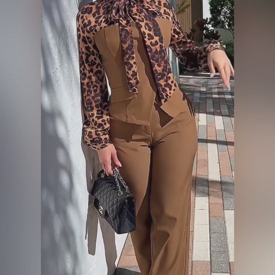 2 Pieces Outfit Leopard Print Spliced Tie Neck Long Sleeve Double Breasted Front Flap Detail Top and Zipper Fly Wide Leg Pants Set Casual Commuting Set