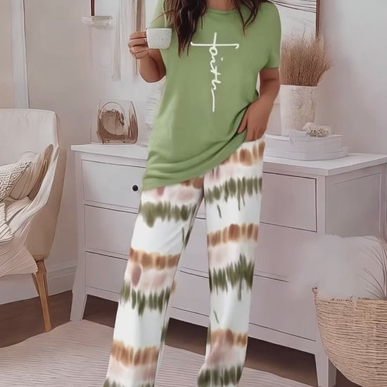 2 Pieces Outfit Letter Print Round Neck Short Sleeve Top And Tie Dye Print Elastic Waist Loose Fit Pants Set Casual Pajamas Set