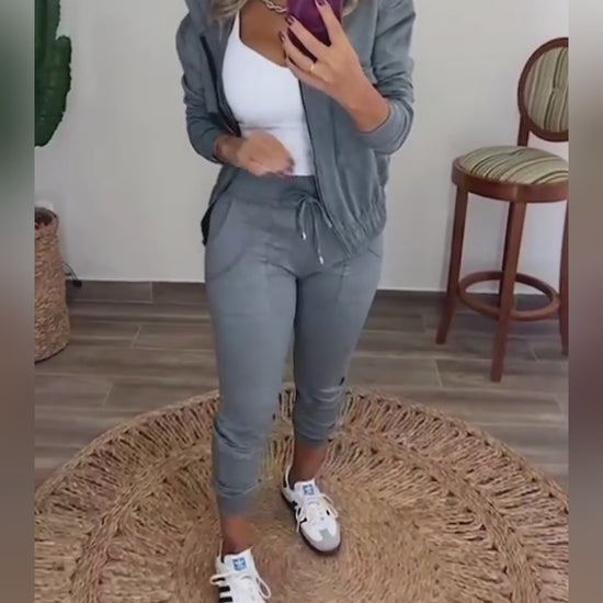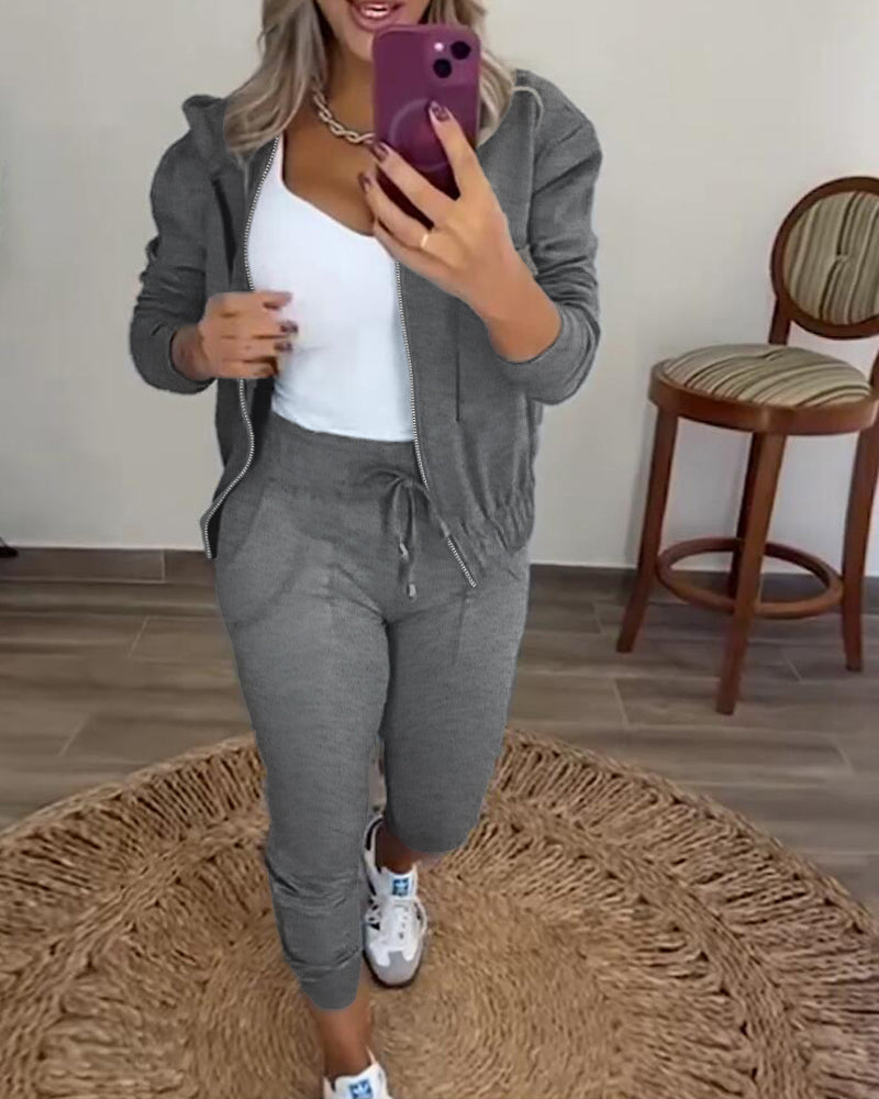 2 Pieces Outfit Long Sleeve Zip Up Flap Pockets Design Stretchy Hem Hoodie Coat and Drawstring Elastic Waist Slim Fit Pants Set