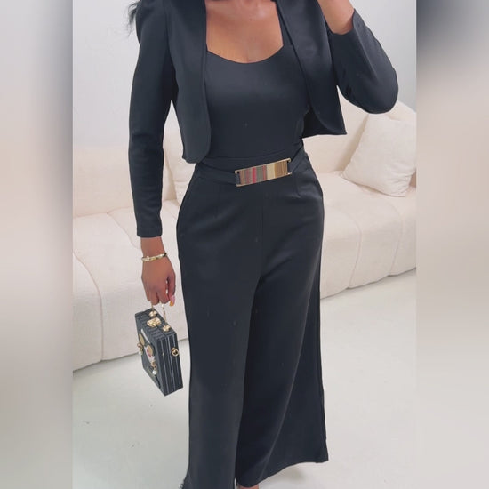 Silhouette & Fit: Tailored jumpsuit with cinched waist and clean lines creates a sleek, flattering silhouette, while the cropped cardigan adds relaxed layering.