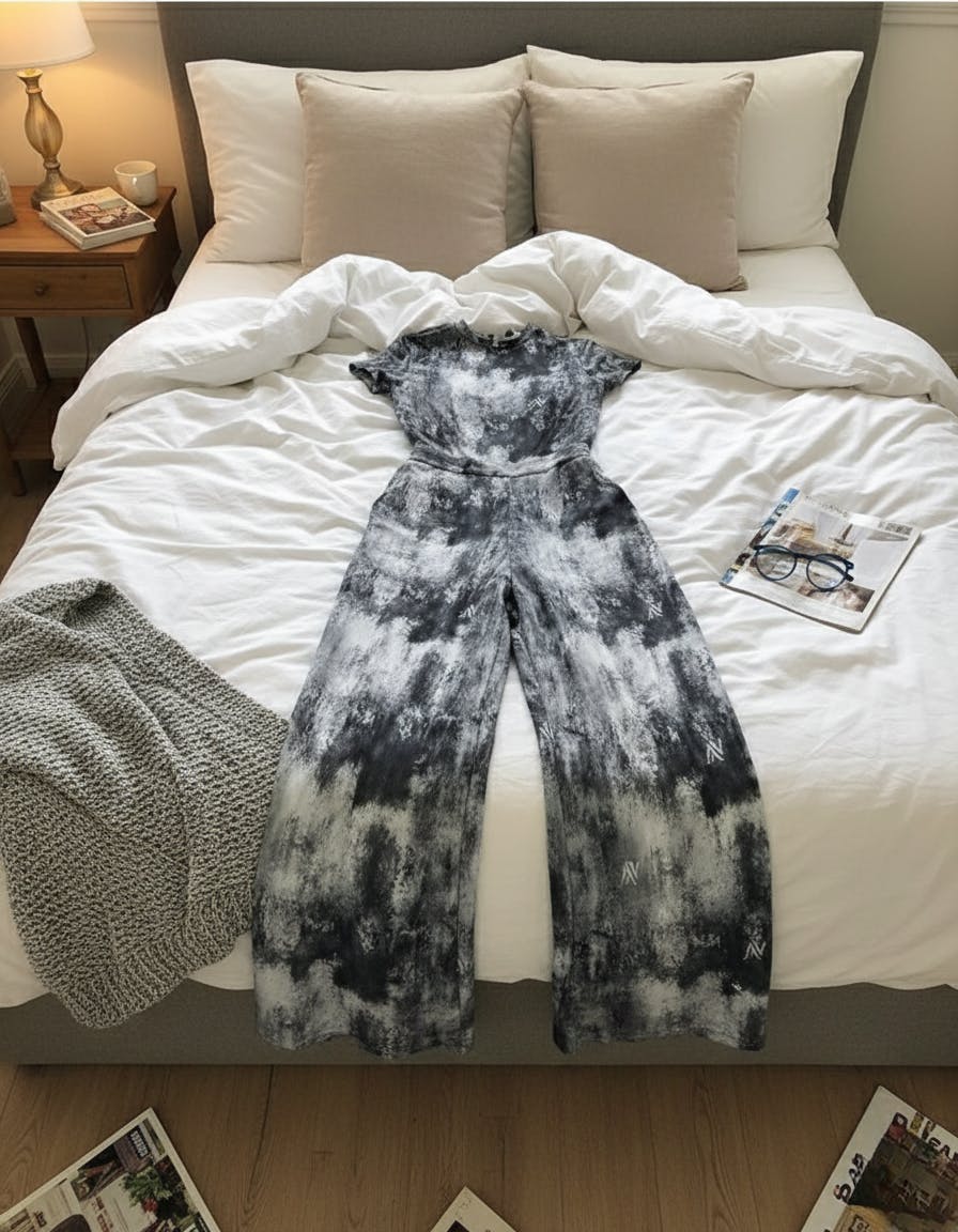 Design Details: Features artistic tie dye print with a watercolor effect for visual depth. Sheer mesh fabric adds light transparency and elegance, while the pants include practical pockets, balancing refined style with everyday functionality.