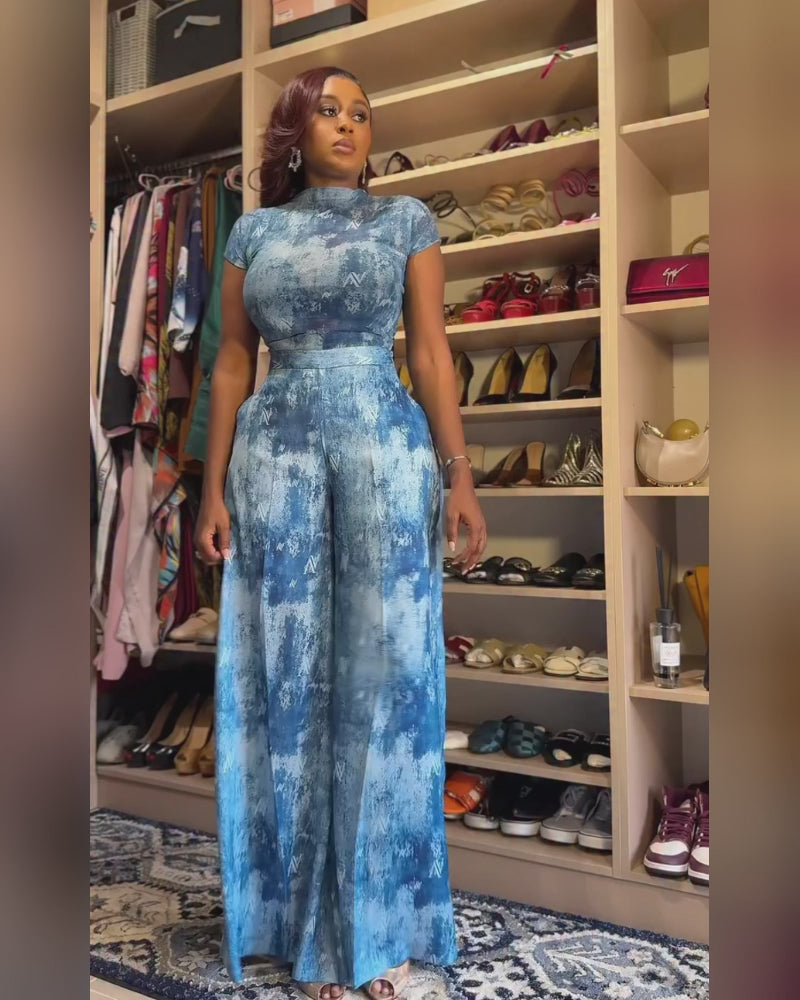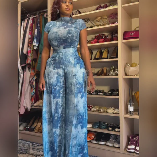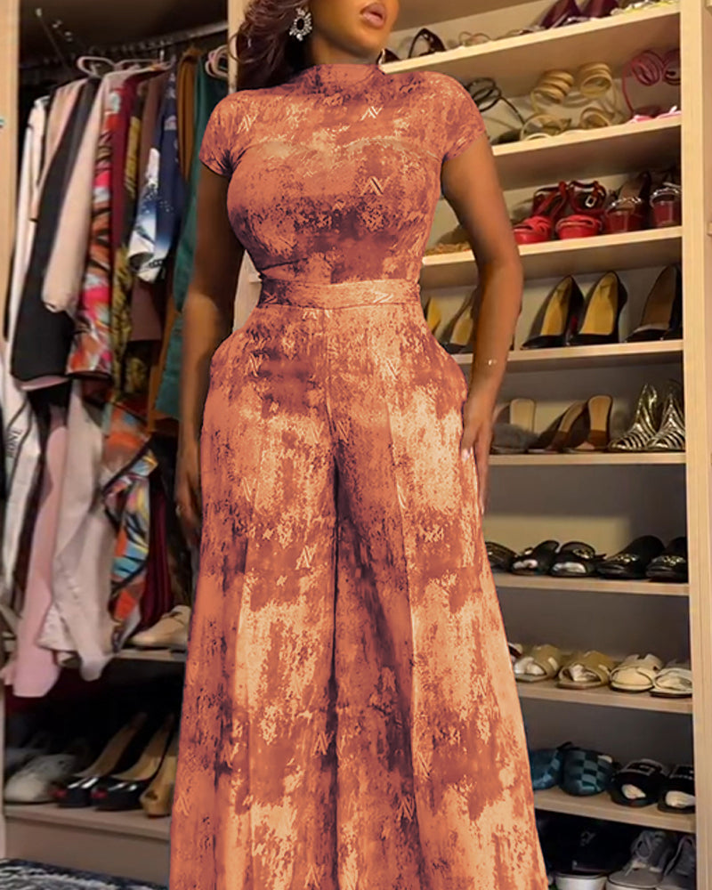 2 Pieces Outfit Mock Neck Short Sleeve Slim Fit Top and High Waist Wide Leg Pants Set Casual Tie Dye Print Sheer Mesh Set
