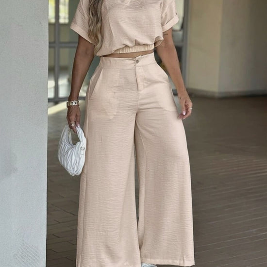 2 Pieces Outfit Notch Neck Turn-Up Cuffs Hollow-out Back Stretchy Hem Crop Top and Casual Zipper Fly Elastic Back Waist Wide Leg Pants Set