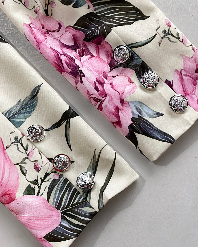 - Design Details: The blazer features functional buttons and a chic notch collar, while the skort includes a side zipper and subtle slit, combining practicality with elegant design. Both pieces showcase a cohesive floral print that unifies the outfit.