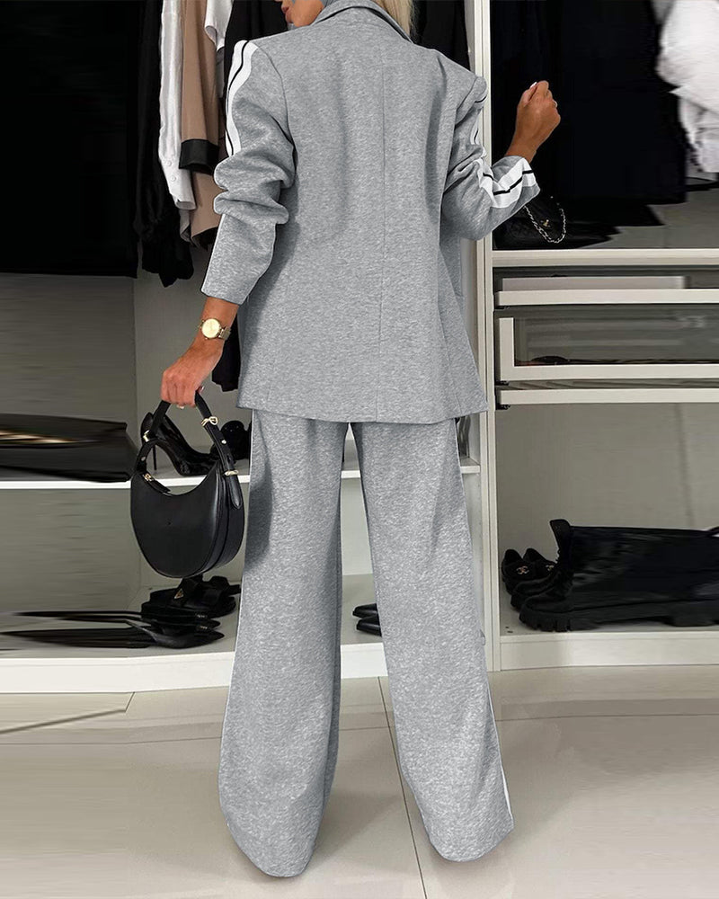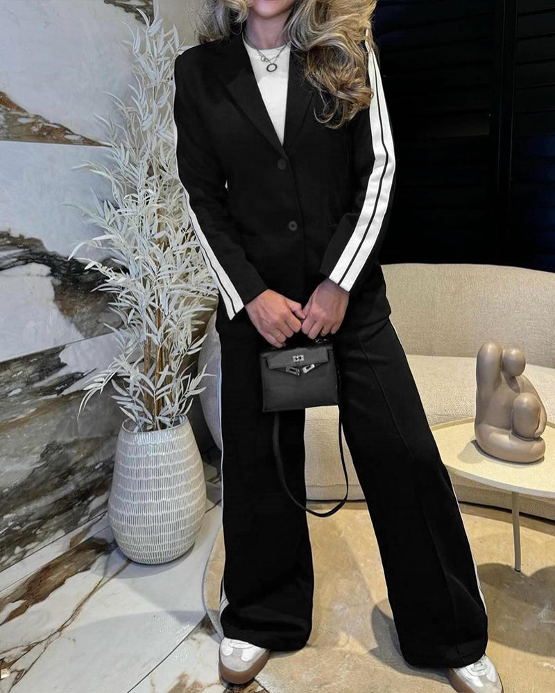 2 Pieces Outfit Notched Collar Single Breasted Pockets Design Coat And Elastic Waist Seam Front Wide Leg Pants Set Casual Contrast Side Striped Blazer Set