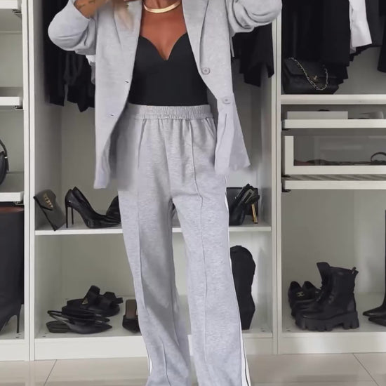 Silhouette & Fit: Loose-fit blazer and wide-leg pants create a relaxed, casual silhouette suitable for various body types.