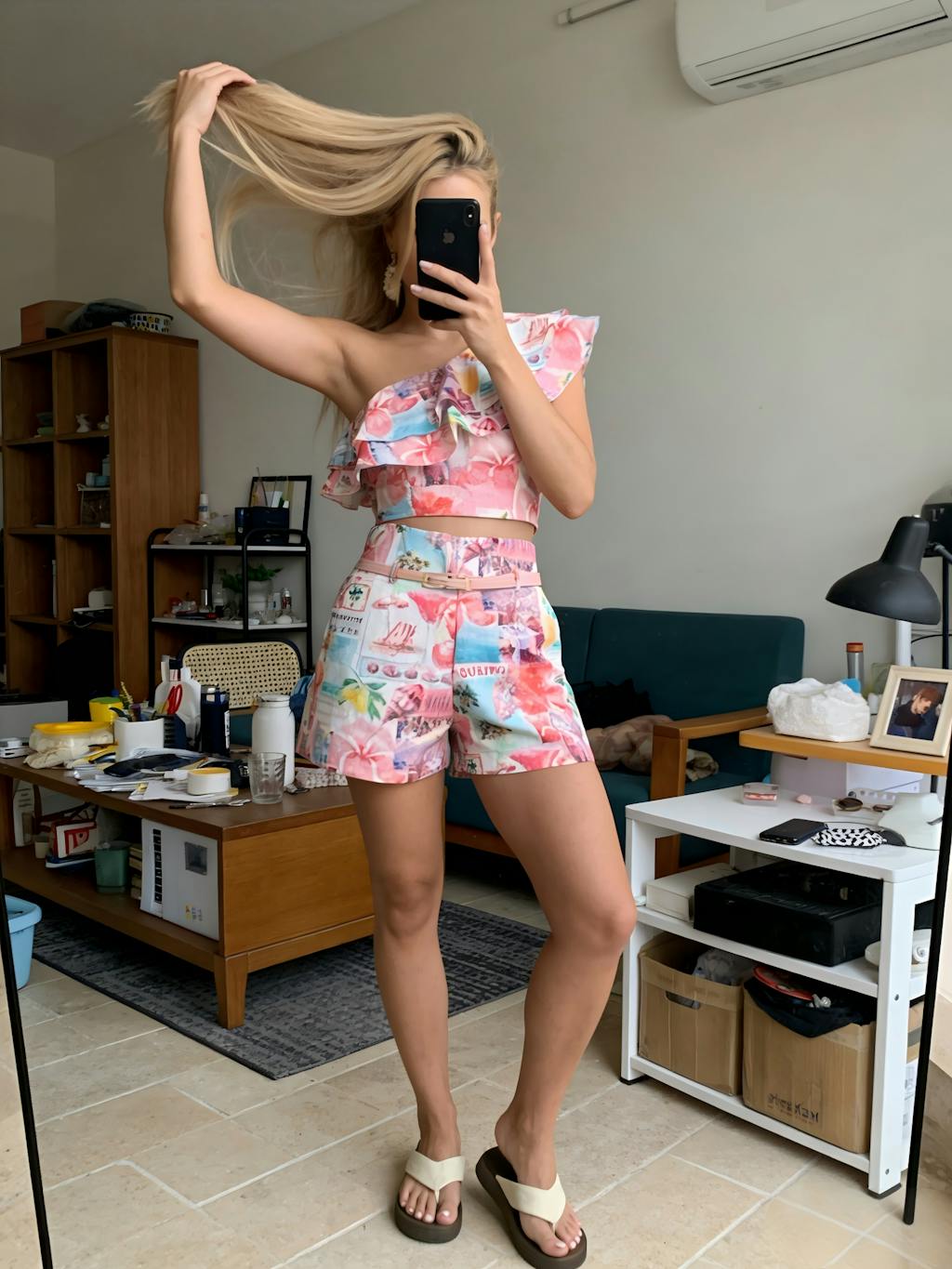 Silhouette & Fit: Features a cropped one-shoulder top paired with high-waisted shorts to visually lift the waistline. The short-length top balances proportions, while the structured shorts offer a flattering fit that defines the waist without feeling restrictive.