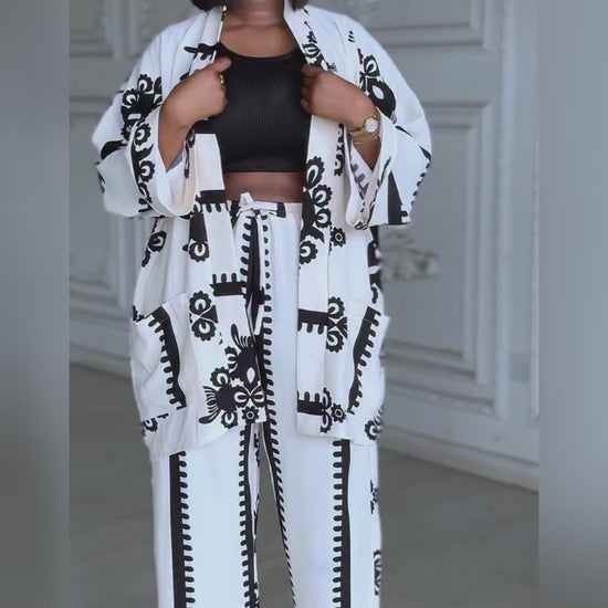 Design Details: Open front coat features long sleeves and contrasting baroque print, while pants echo the print and include pockets and drawstring waist, combining casual vintage style with functional details.
