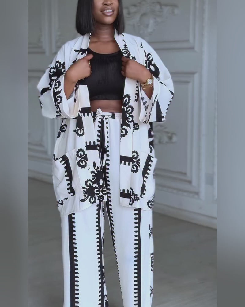 2 Pieces Outfit Open Front Long Sleeve Coat and Drawstring Elastic Waist Wide Leg Pants Set Casual Vintage Baroque Print Loose Fit Set without Tank Top
