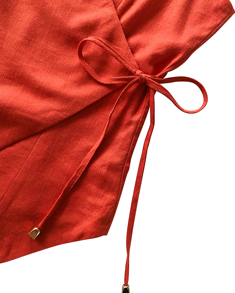 2 Pieces Outfit Plain Wrap V Neck Criss Cross Tied Detail Linen Top and Casual Pockets Patch Shorts Set