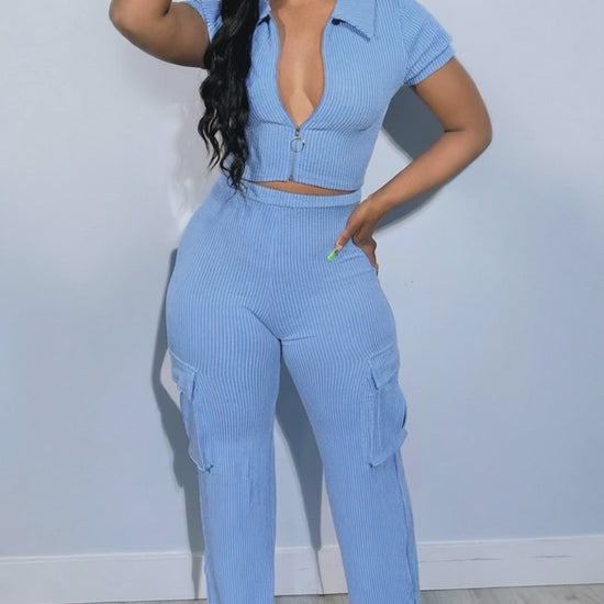 2 Pieces Outfit Polo Collar Short Sleeve Zip Up Slim Fit Crop Top and High Waist Elastic Waist Cargo Pockets Design Pants Set Casual Ribbed Set