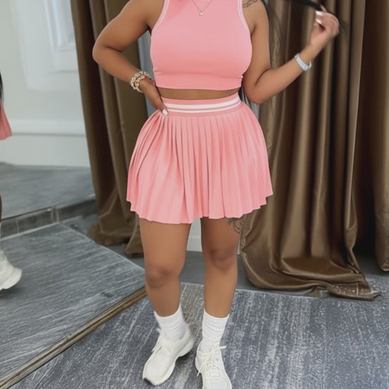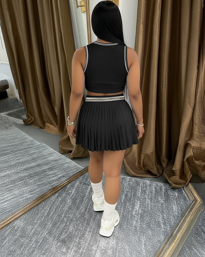 Silhouette & Fit: The sleeveless crop tank top hugs the torso to accentuate the waistline, creating a flattering shape, while the pleated mini skirt features a voluminous silhouette with an elastic waistband. This combination ensures a balanced fit that enhances curves and allows ease of movement.