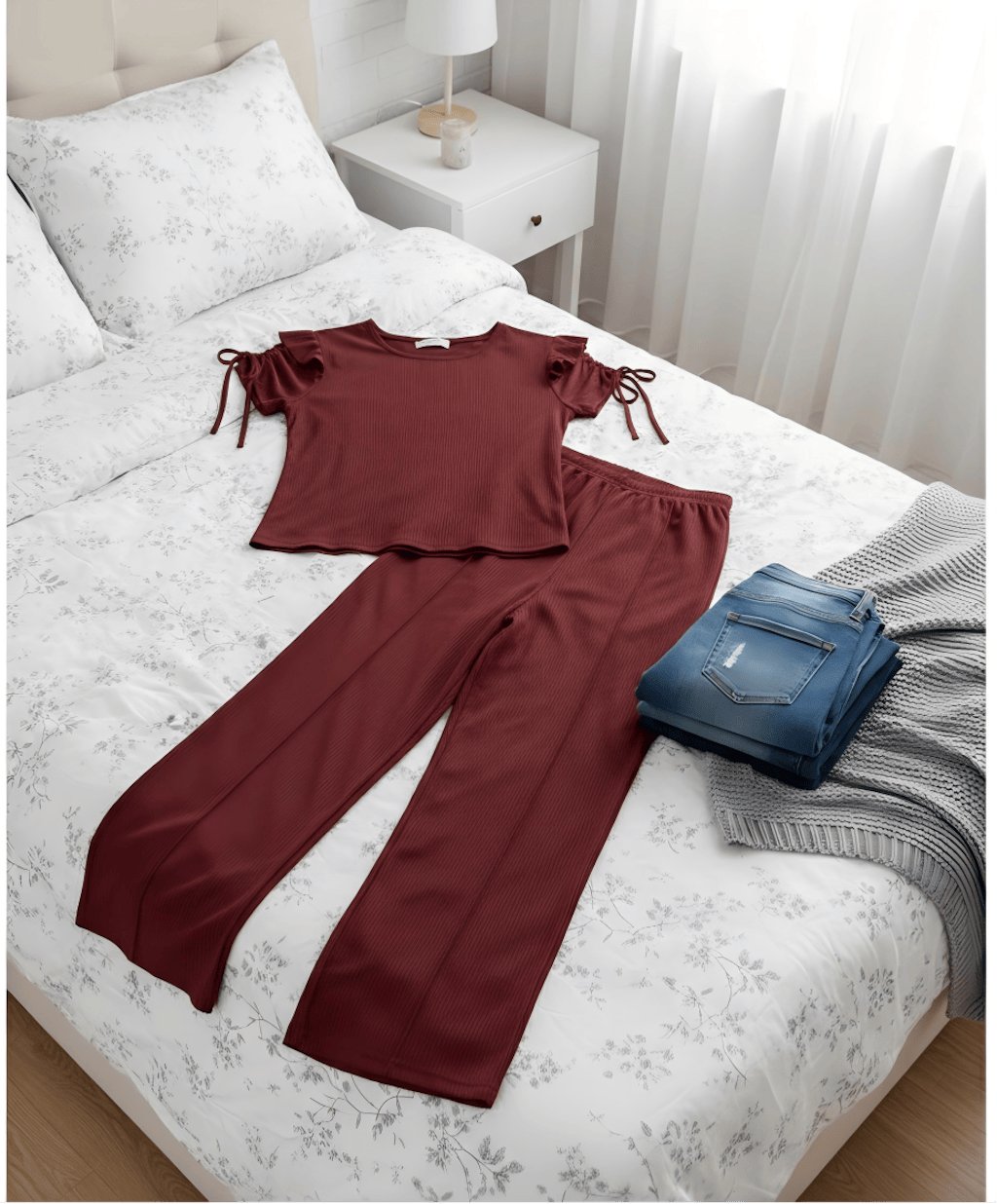 Design Details: The round-neck top features ruffle trim at the sleeves with a drawstring detail, adding soft definition to the simple knit base. The wide leg pants are finished with a seam front design, elastic waist, and functional pockets for everyday practicality.