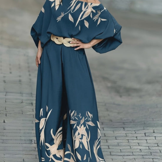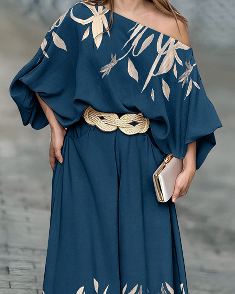 2 Pieces Outfit Skew Neck Batwing Sleeve Top and Zipper Fly Elastic Back Waist Wide Leg Pants Set Casual Plants Print Loose Fit Set without Belt