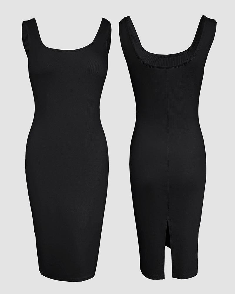 2 Pieces Outfit U-Neck Slit Back Slim Fit Knit Tank Dress and Pearl Button Front Baseball Coat Casual Ribbed Set