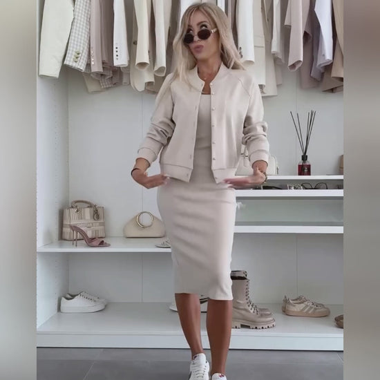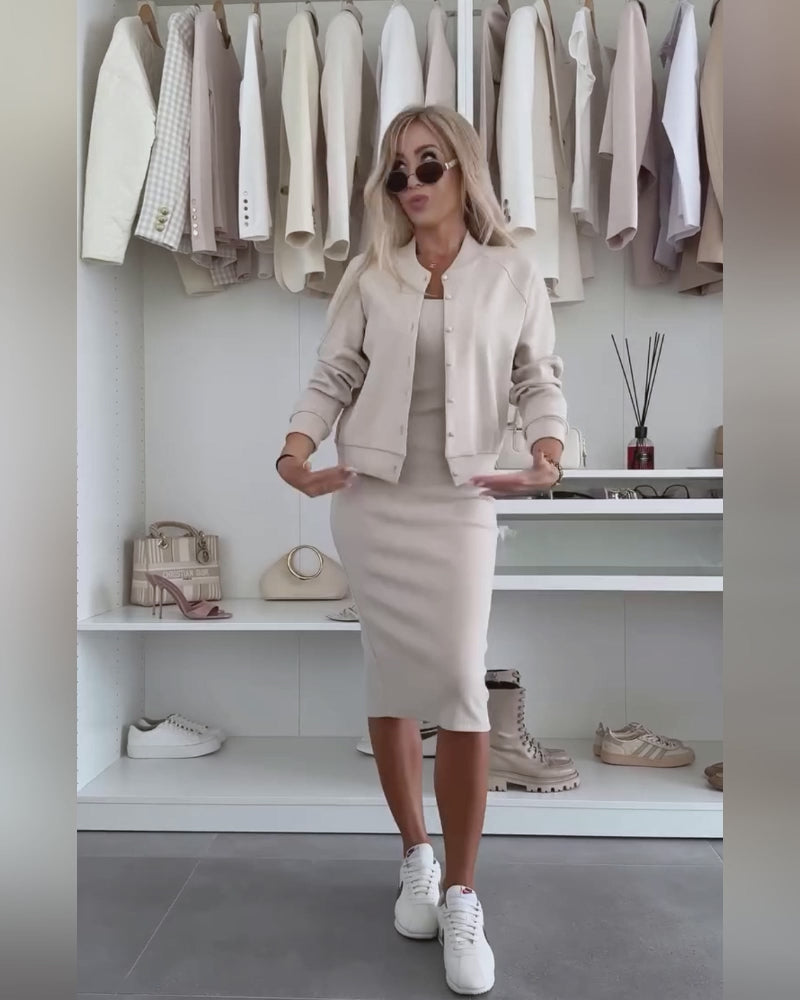 - Silhouette & Fit: Slim-fit tank dress with a midi length hugs the body, while the relaxed baseball coat balances the silhouette for chic layering.