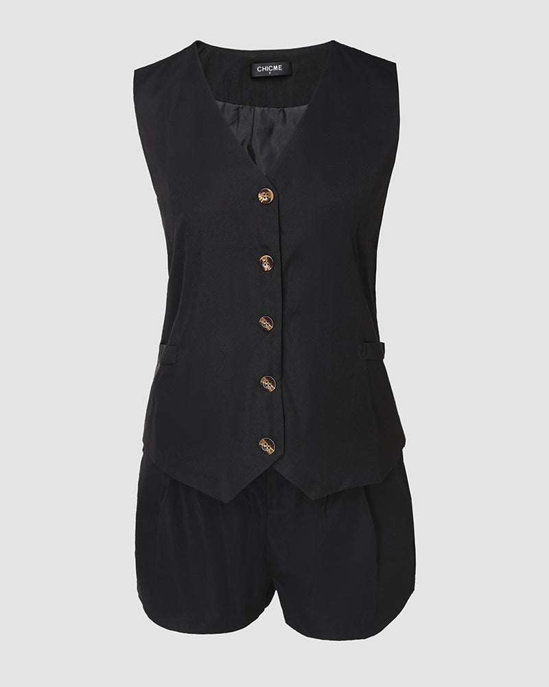 2 Pieces Outfit V-Neck Sleeveless Button Front Vest and Zipper Fly Colorblock Elastic Back Waist Shorts Set Casual Blazer Set